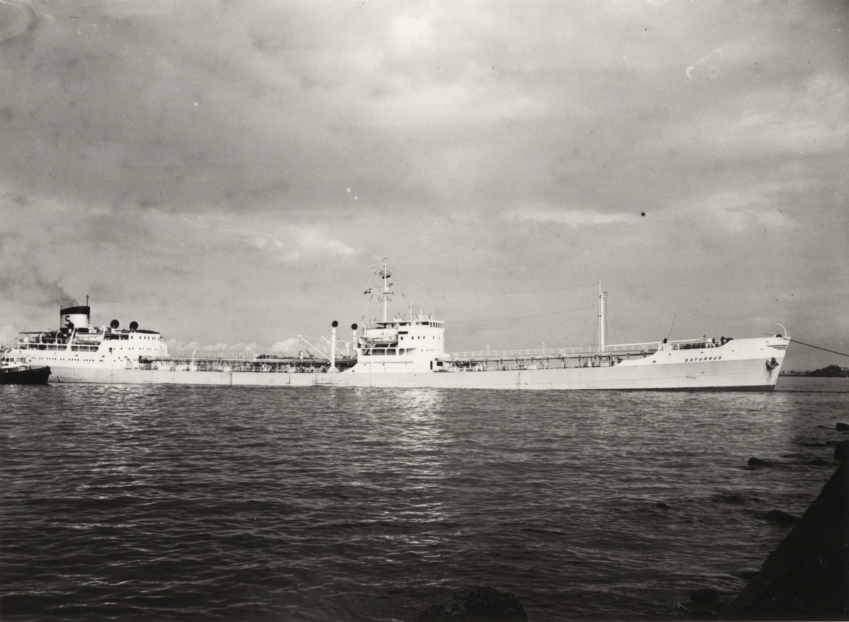 Foto i svartvitt visande tankmotorfartyget "SATURNUS" i Köpenhamn under 1950-talet.