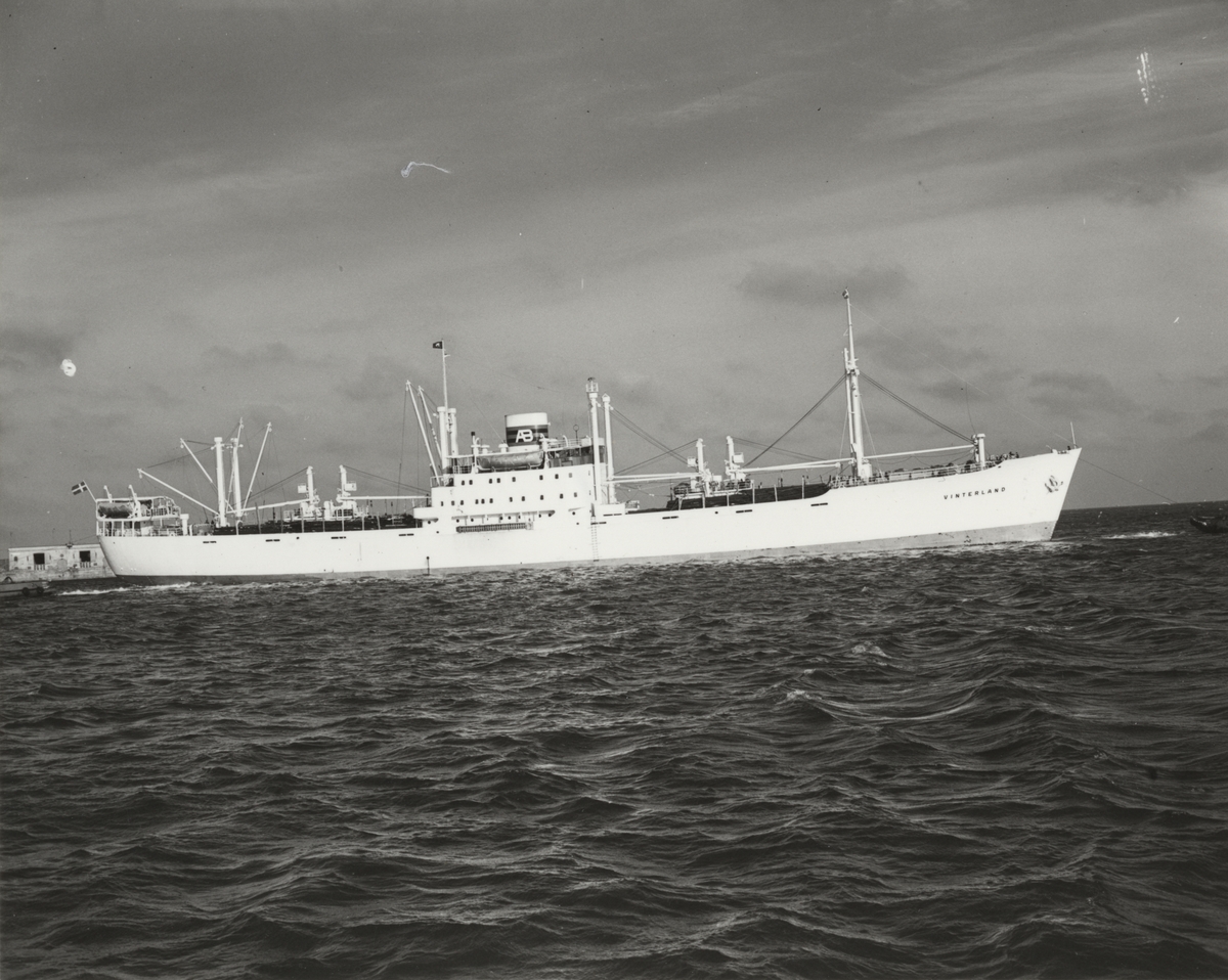 Foto i svartvitt visande lastmotorfartyget "VINTERLAND" i Köpenhamn någon gång under åren 1954 - 1962.