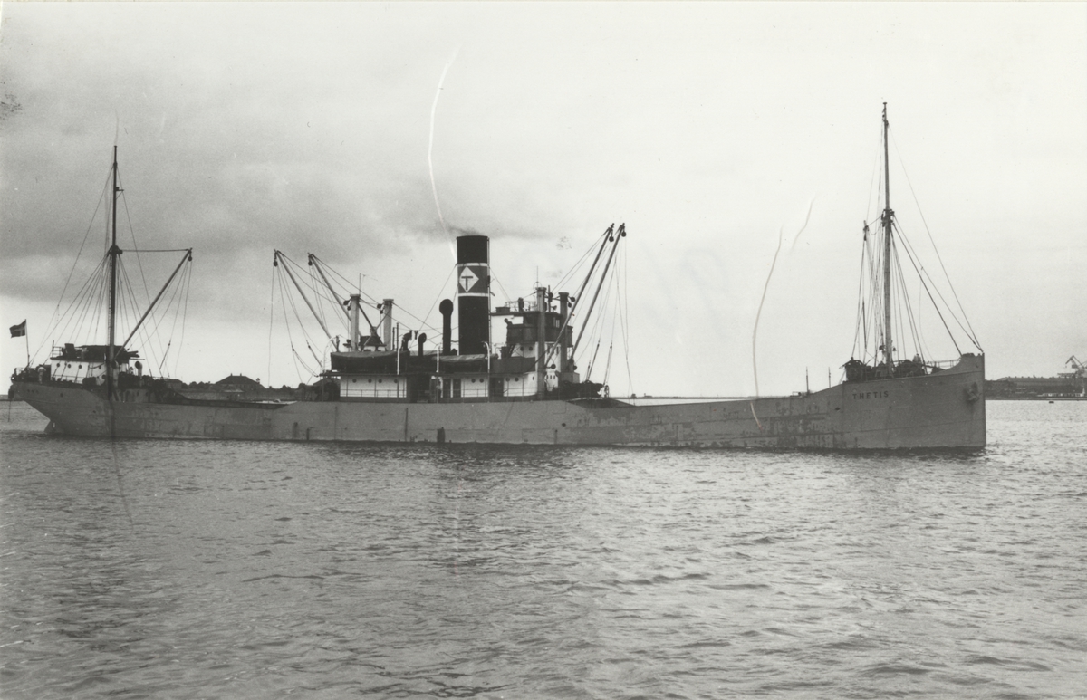 Foto i svartvitt visande lastångfartyget "THETIS" i Köpenhamn den 29.8.1954.