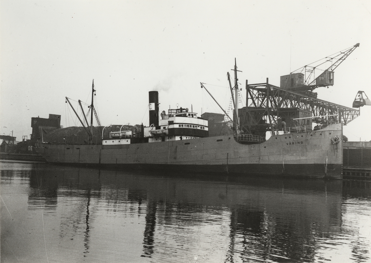 Foto i svartvitt visande lastångfartyget "VÄRING" i Köpenhamn under 1950-talet.