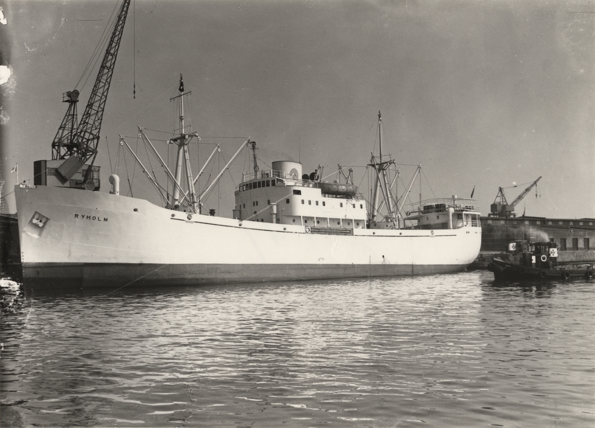 Foto i svartvitt visande lastmotorfartyget "RYHOLM" i Köpenhamn under 1950-talet.