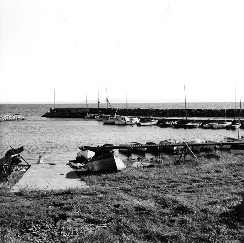 Skåne, Kristiansstads län, V Karups socken, Ramsjöstrand. Hamnen. Sedd från hamnplanen ut mot SV. I bakgrunden skymtar Kullen. I förgrunden tv en gjuten ramp för upphalning av småbåtar.