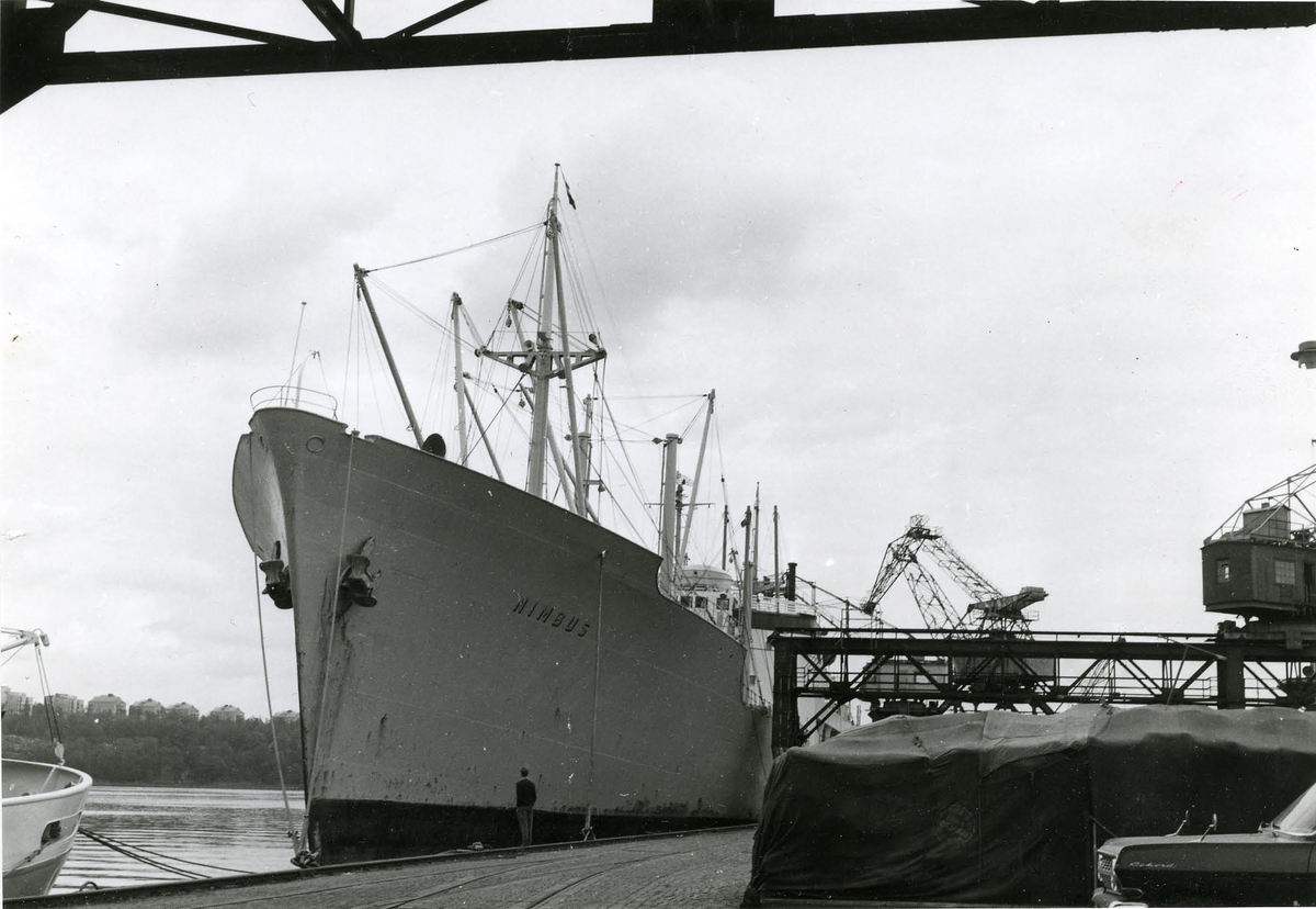 Foto i svartvitt visande hamnbild från Värtan i Stockholm, vid kaj lastmotorfartyg "Nimbus" av Göteborg.