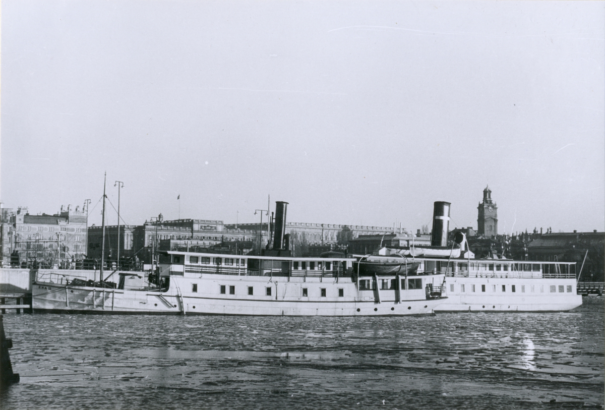 Passagerarångfartygen ENA II av Enköping (tv) och VIKING av Skokloster i vinterkvarter vid Klara Mälarstrand 1957-02-03.