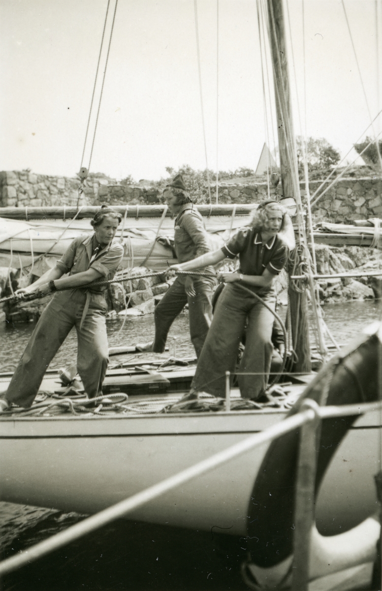 Tre elever från Svenska Seglarskolan arbetar på däck.