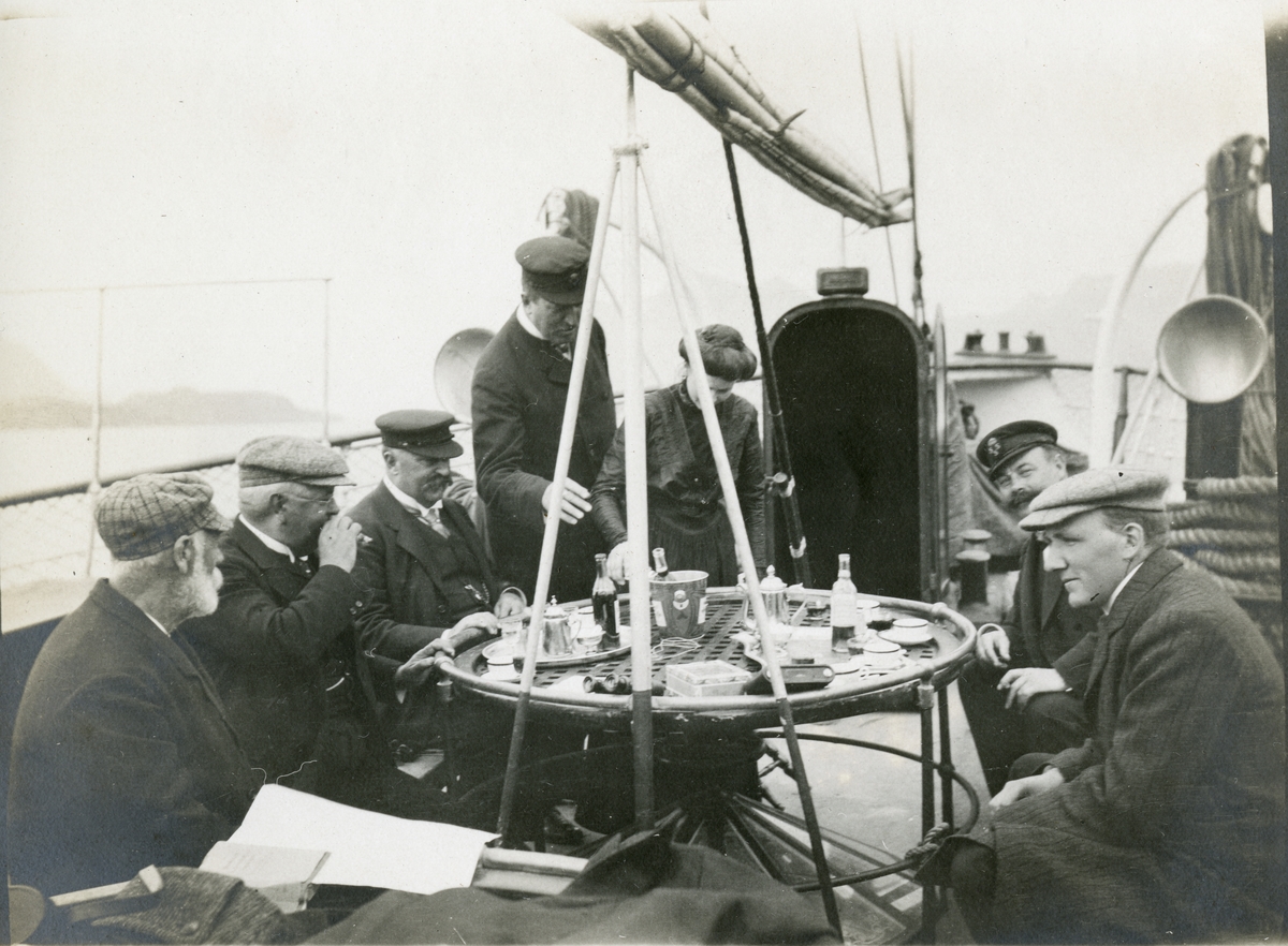 En blandad grupp personer som dricker kaffe och konjak/likör på S/S Aeolus fördäck.