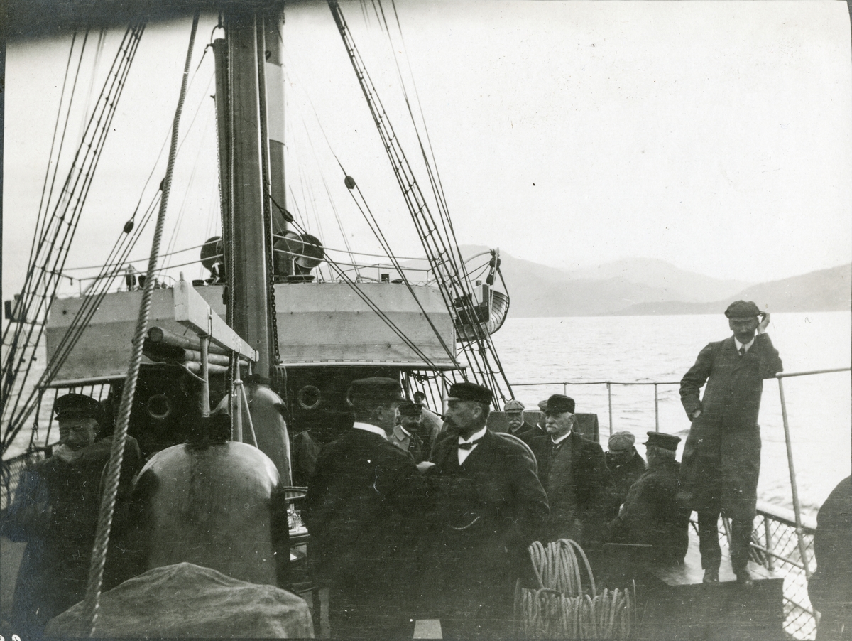 Besättningsmedlemmar och medlemmar ur den 11:e geologiska kongressen på S/S Aeolus fördäck.