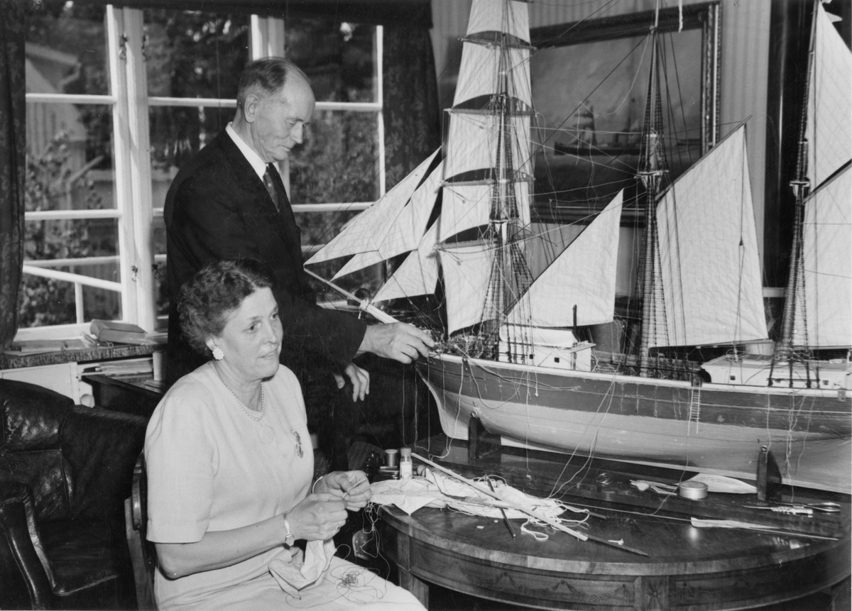 R. Werner med hustrun Elisabet Werner renoverar modell av tremastad skonare från 1800-talet ur Statens sjöhistoriska museers samlingar.