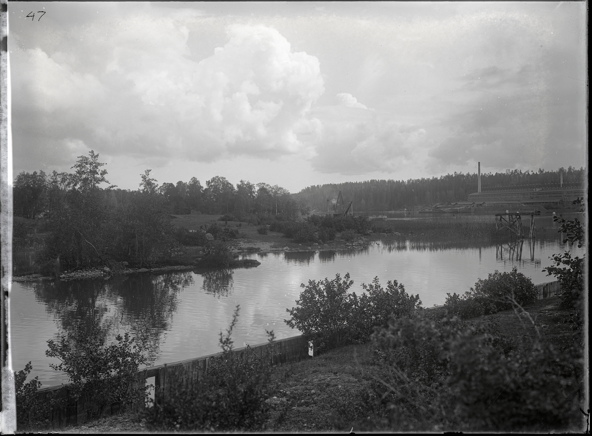 Fotografi taget i samband med byggandet av Södertälje kanalverk. I bakgrunden syns en industri samt en pråm och möjligen en flytande ångdriven grävskopa.