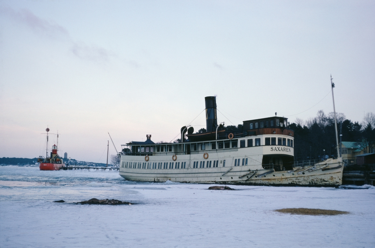 S/S SAXAREN i Sandhamn. I bakgrunden ett fyrskepp.