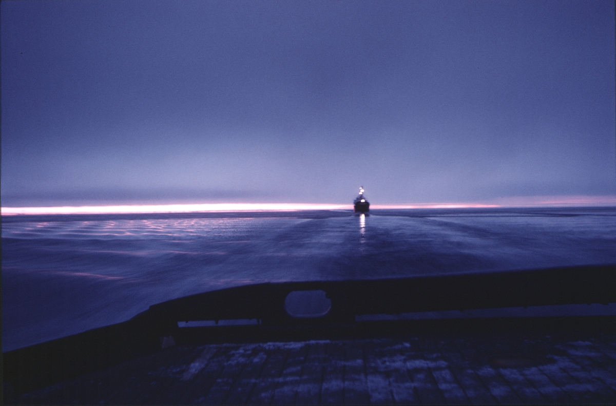 Ymer leder ett lastfartyg genom isen vid solnedgång.