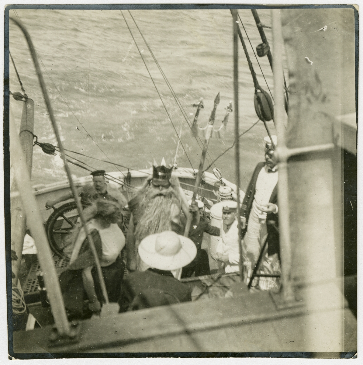 Linjedop ombord på Antarktiska undsättningsexpeditionens fartyg FRITHJOF söndagen den 4 oktober 1903. Knut Svensson utklädd till Neptun.