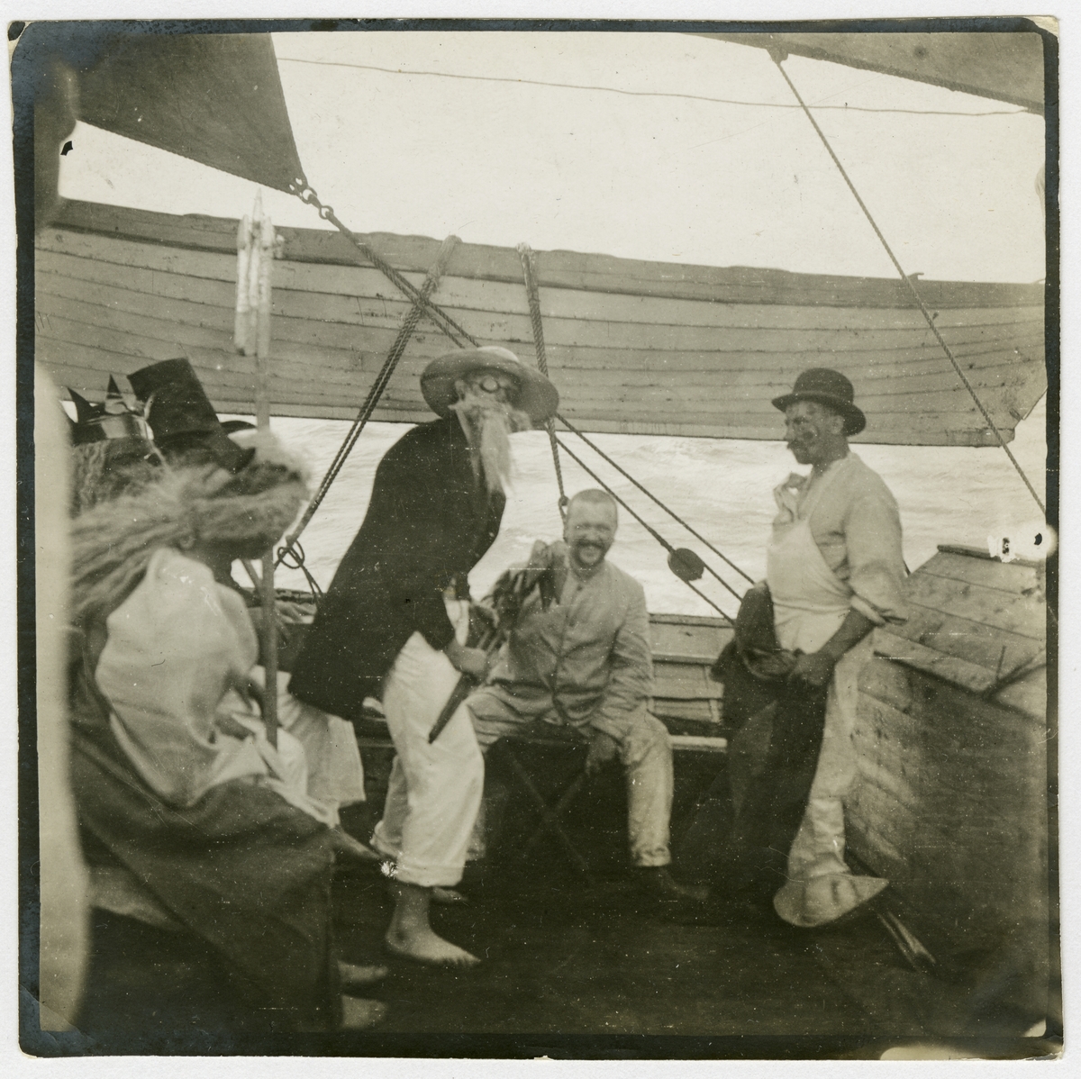 "Doktorn hönsas" (text på originalets baksida). Jacob Torgersruuds linjedop ombord på Antarktiska undsättningsexpeditionens fartyg FRITHJOF söndagen den 4 oktober 1903.