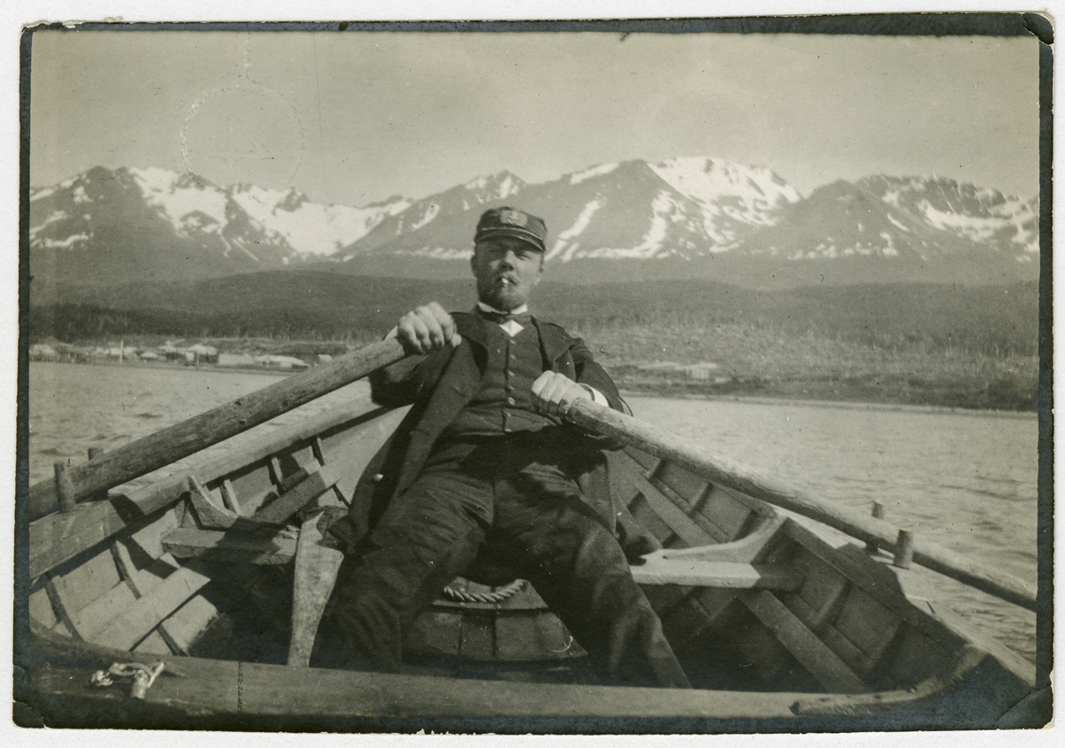 Antarktiska undsättningsexpeditionen. Kapten Olof Gyldén ror in mot Ushuaia, huvudstad i den argenstinska provinsen Eldslandet / Tierra del Fuego, mitten av november 1903.