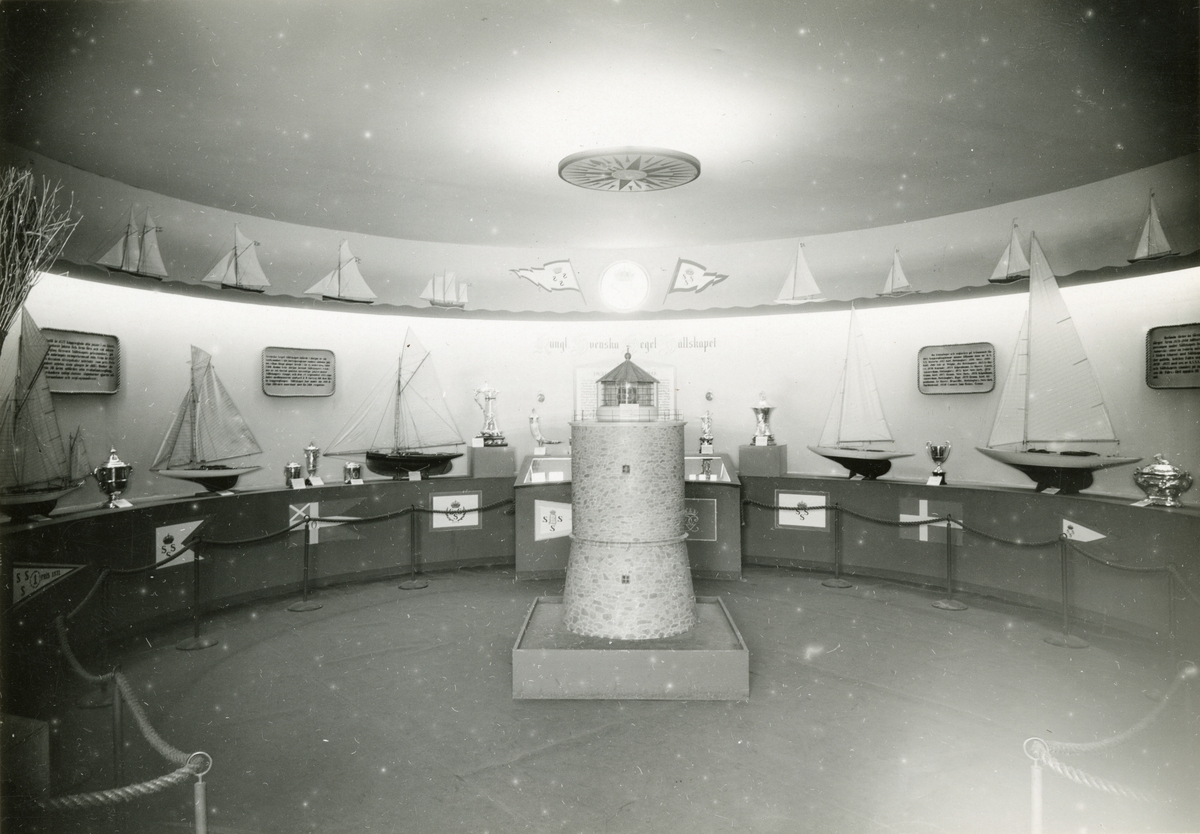 Utställningen "Svea Rike" på Stockholmsutställningen 1930. Presentation av S.S.S. (Kungliga Svenska Segelsällskapet). Fartygsmodeller, pokaler m.m. i samband med Kungliga Svenska Segelsällskapets 100-årsjubileum.