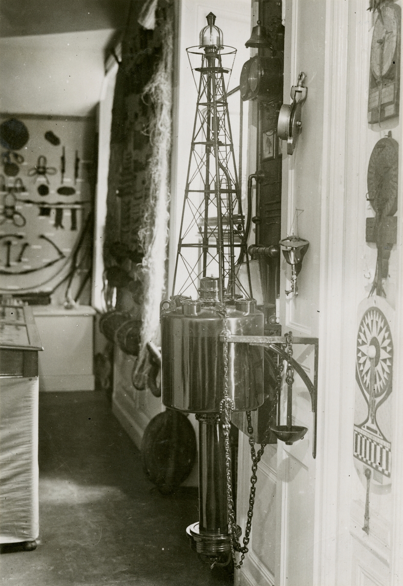 Utställning i Lots- och fyrrummet i Sjöfartsmuseet, Skeppsbron 36 Stockholm. Modell av lysboj, pinnkompass m.m.