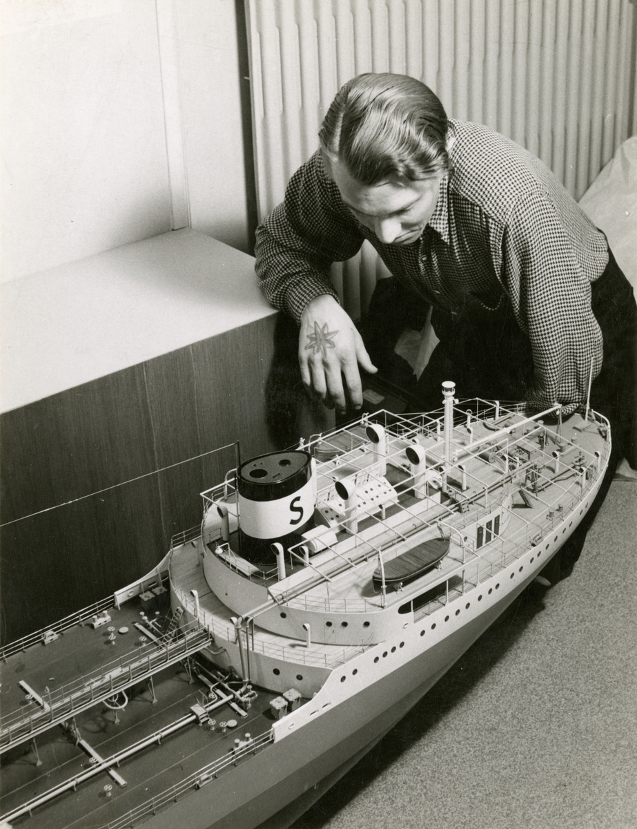Utställning i Sjöfartsavdelningen, avdelning för Nyare varv. En ung man med en tatuerad kompassros på handen tittar på fartygsmodellen av SVEADROTT.
