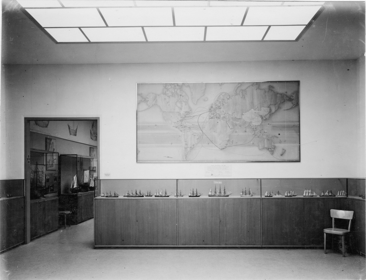 Utställning i Översiktsrummet i Sjöfartsavdelningen. Karta nr 3 visande "Svenska segelsjöfarten år 1880" samt fartygsmodeller.