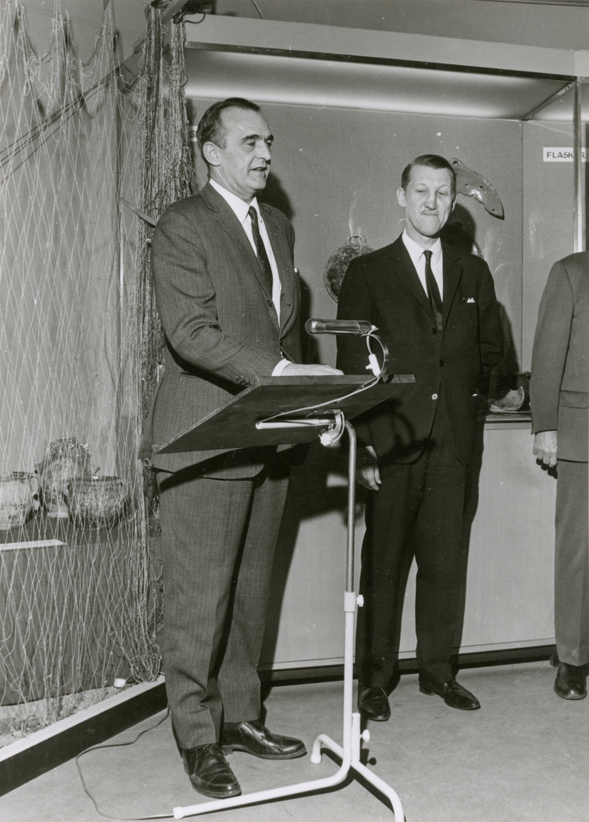 Utställningen "Djurhamn Historisk ankargrund". Kapten Bengt Ohrelius håller tal flankerad av museidirektören Per Lundin vid vernissagtillfället.