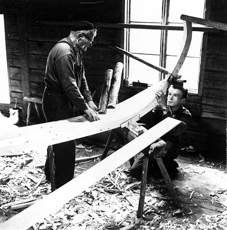 Neg nr 123. Första bordgångens förliga halva om babord har satts fast och avritning görs vid stäven. Foto 9.8 (1962).