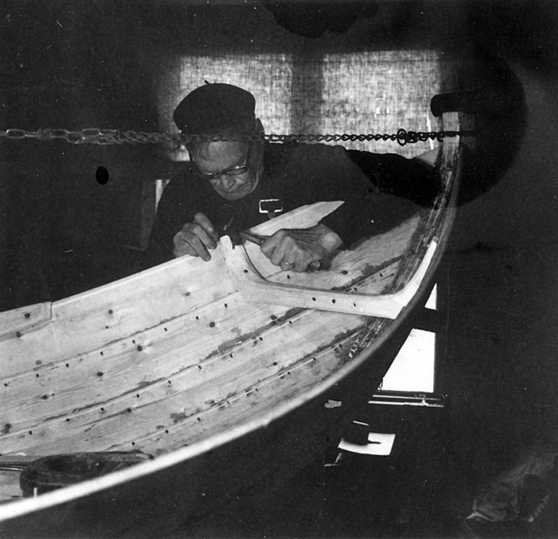 Neg nr 293, Framknaften spikas på plats. Obs! att gardinen är neddragen mot den starka solen för att hindra en för hastig torkning av virket i båten. Foto 21.8 (1962).