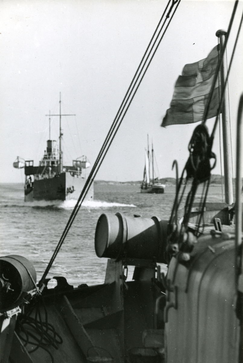 Göteborgs Örlogsdepå. H.M. Hjvb 384. På gång i Göteborgs södra skärgård mot Göteborg. Det eskorterade fartyget följer i eskortfartygets kölvatten. Det går med båtarna i utsvängda dävertar.