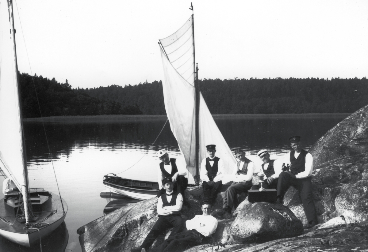 Män från Stockholms segelsällskap som deltagit i segling om 1:a klassens vandringspokal. Här på klippan med pokalen.