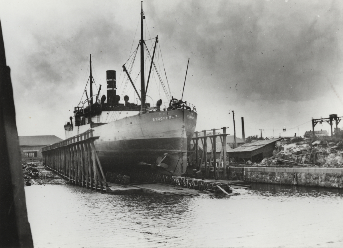 Det kompositbyggda lastångfartyget TYR på Oskarshamns varv för att ersätta ek/furu bordläggningen med stålplåtsbordläggning.