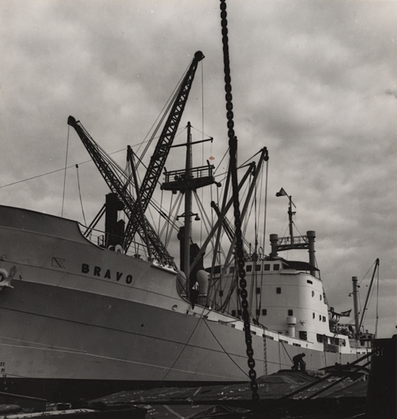 Titel: Lastmotorfartyget BRAVO av Oslo i East India Dock, London 1954.
