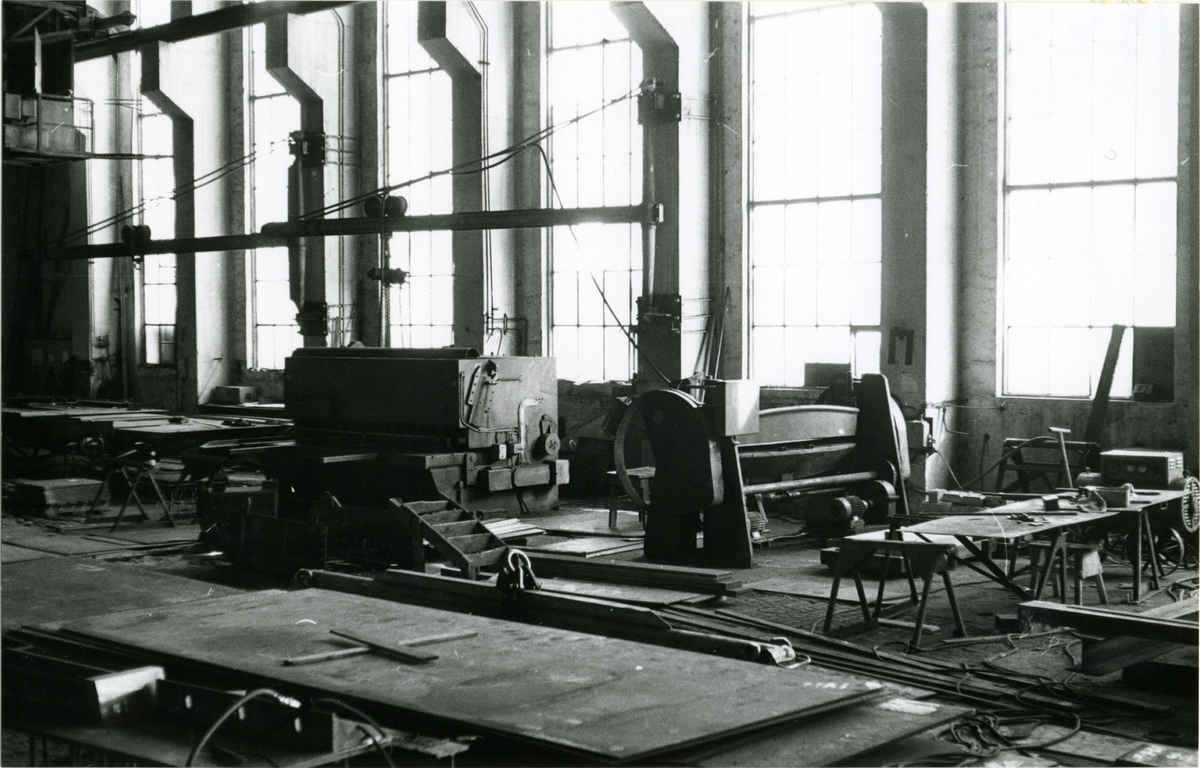 3050 x 15, inköpt 1957, Eisen U. Hammerwerk. Arbetslängd 3000 mm. Max. plåttjocklek 15 mm. Till höger en vanlig gradsax.