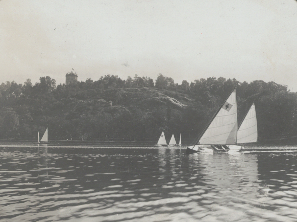 Segelkanoter, bl a Yrhättan, under kappsegling på Djurgårdsbrunnsviken.