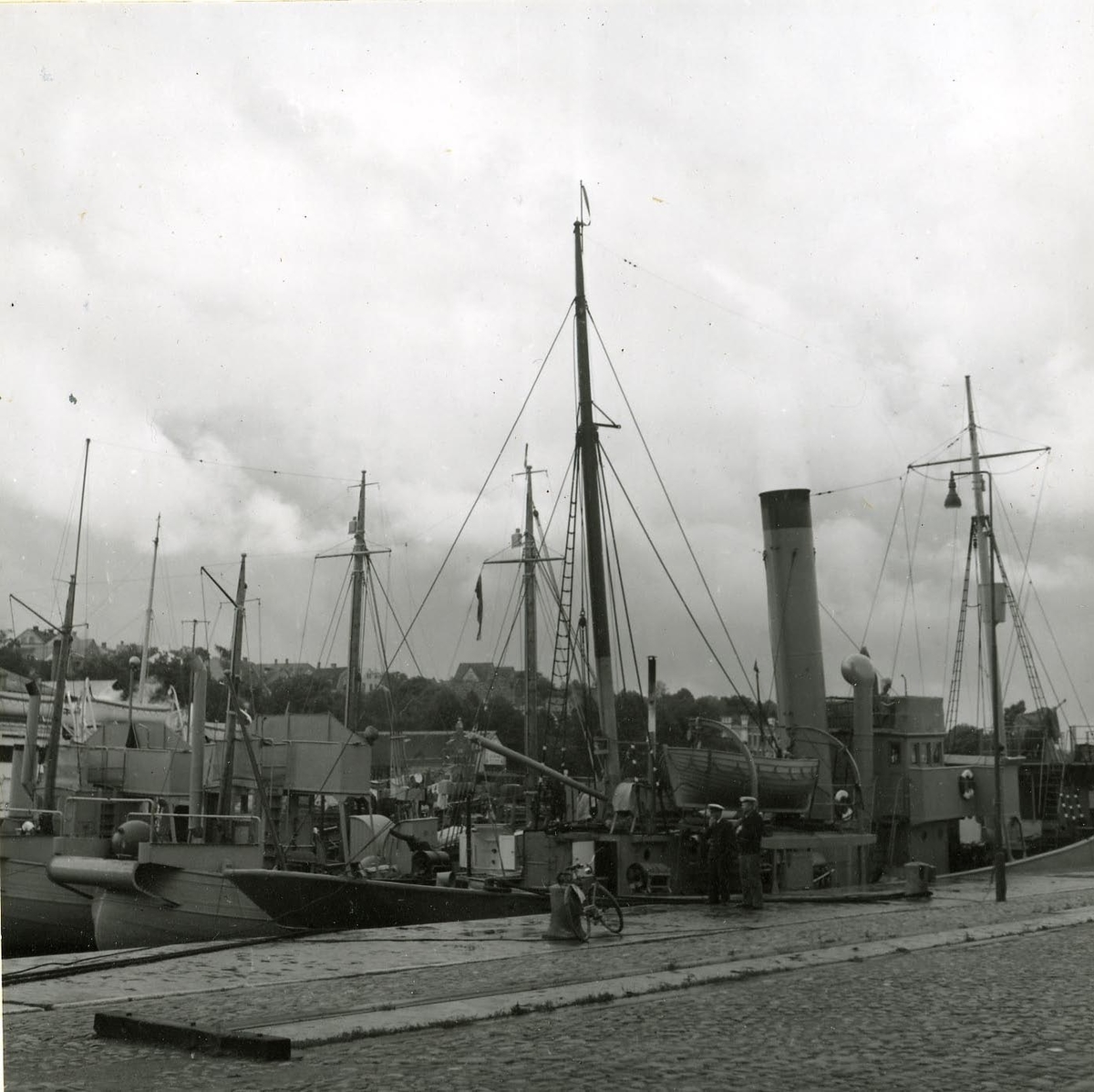 Fartyg av skilda slag, tilldelade Gotlands marin distrikt, förtöjda i inre delen av inre hamnen i Visby under den förstärkta försvarsberedskapen 1940.