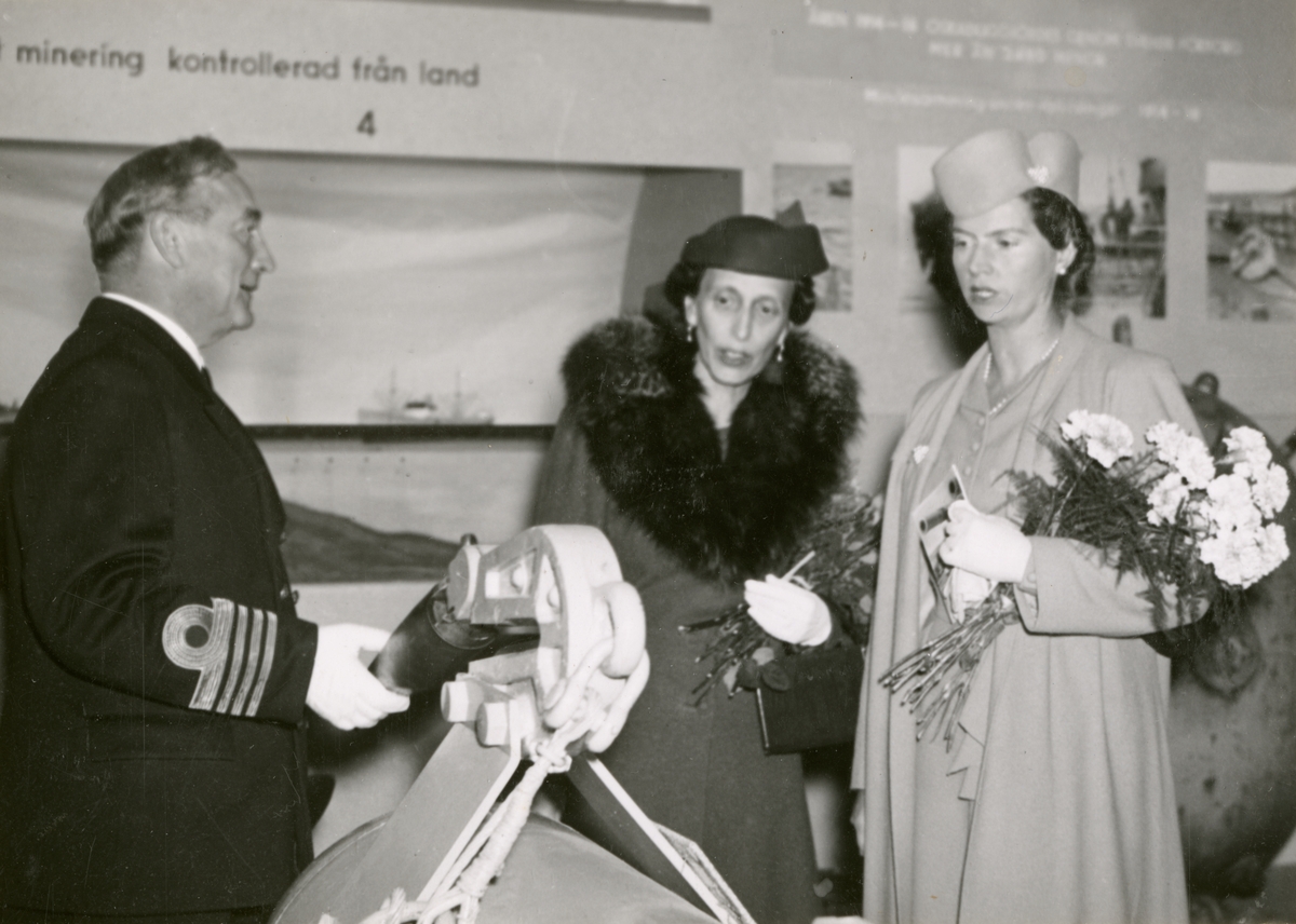 Invigningen av utställningen "Svensk sjömannagärning i allvarstid". Kronprinsessan Louise och prinsessan Sibylla med ett blomsterfång i famnen.