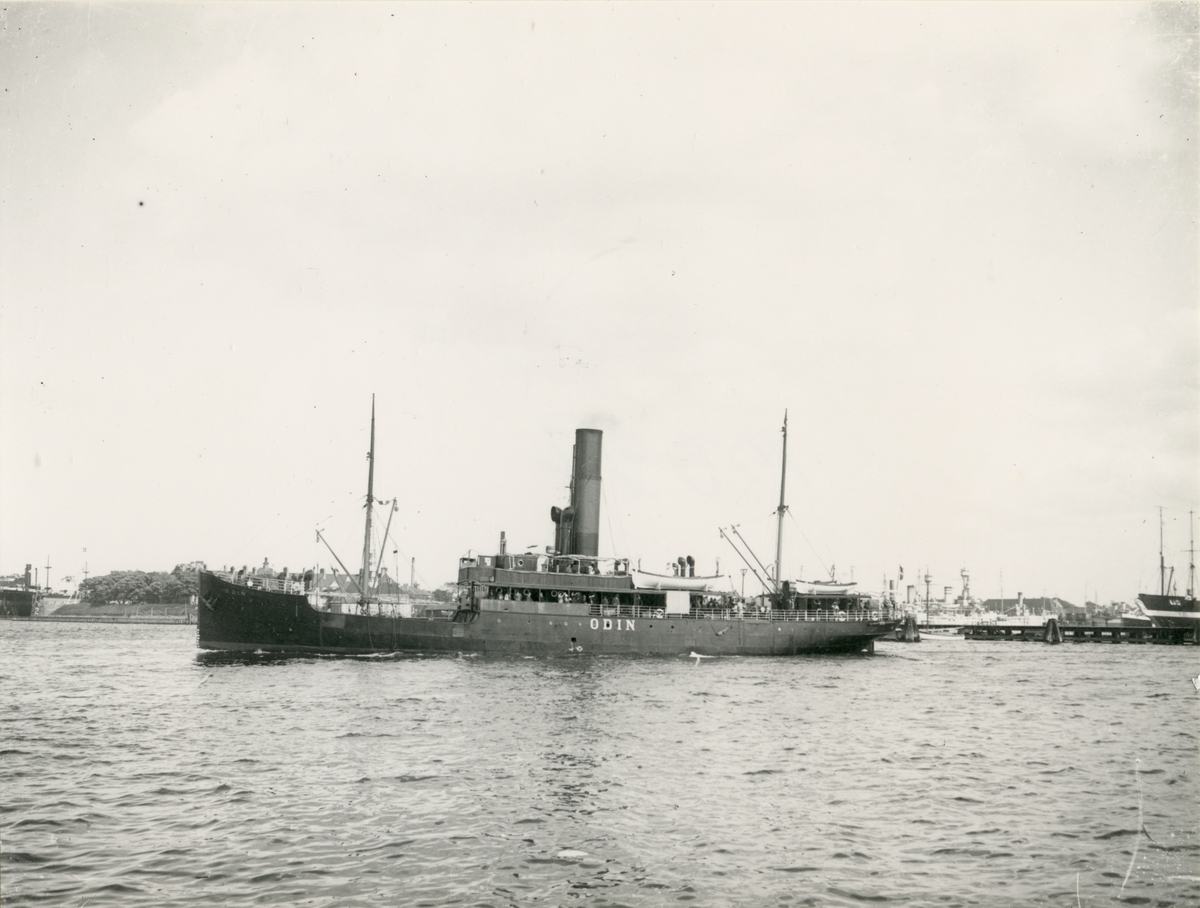 Foto i svartvitt visande passagerar & lastångfartyge Odin i Köpenhamn, början av 1950-talet.