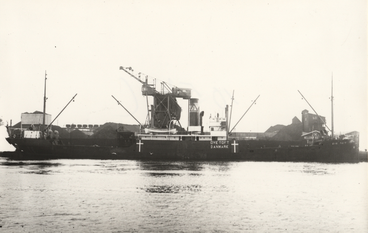 Foto i svartvitt visande lastångfartyget "OVE TOFT" av Köpenhamn vid kaj i Köpenhamn under 1939.