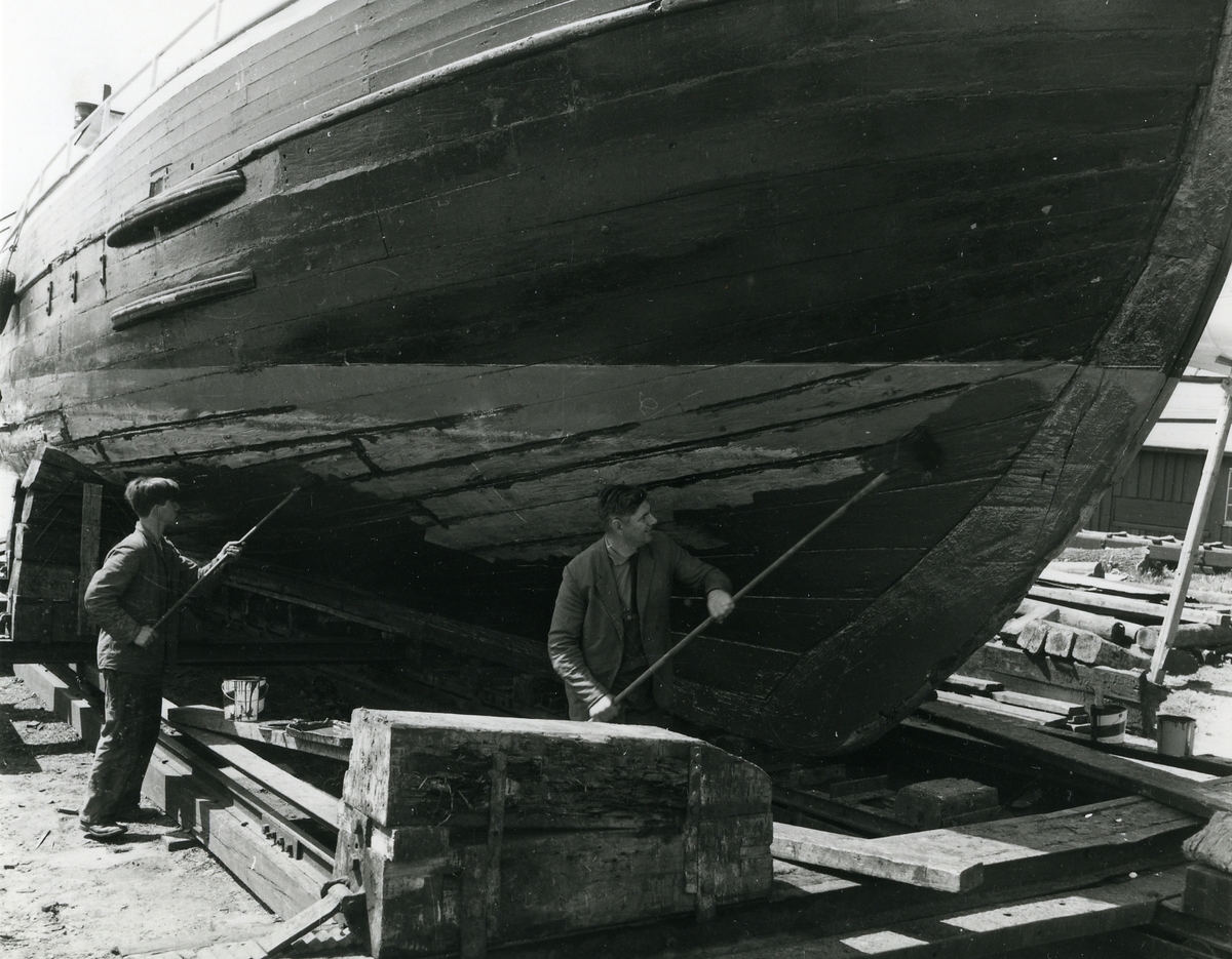 Skrovet under vattenlinjen målas. här används en "roller". Här arbetar Uno Jönsson, som arrenderar fartyget och John Löfström.
