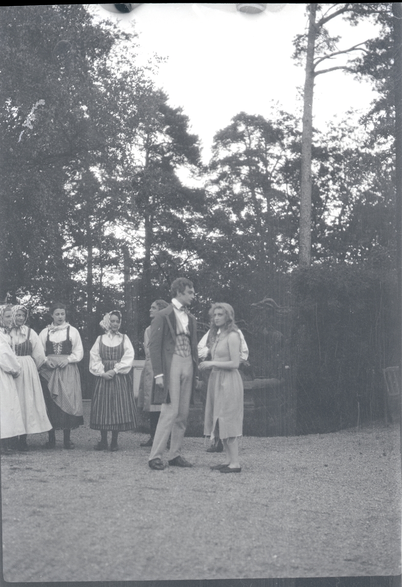 Framförande på Skansen 1929 av dramatiserad version av Selma Lagerlöfs "En herrgårdssägen" i regi av Einar Fröberg. Till v sannolikt Gösta Ekman den äldre.