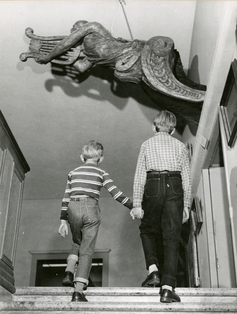 Två pojkar i utställningarna i Sjöfartsavdelningen. "På väg upp till Sjöfartsavdelningen".