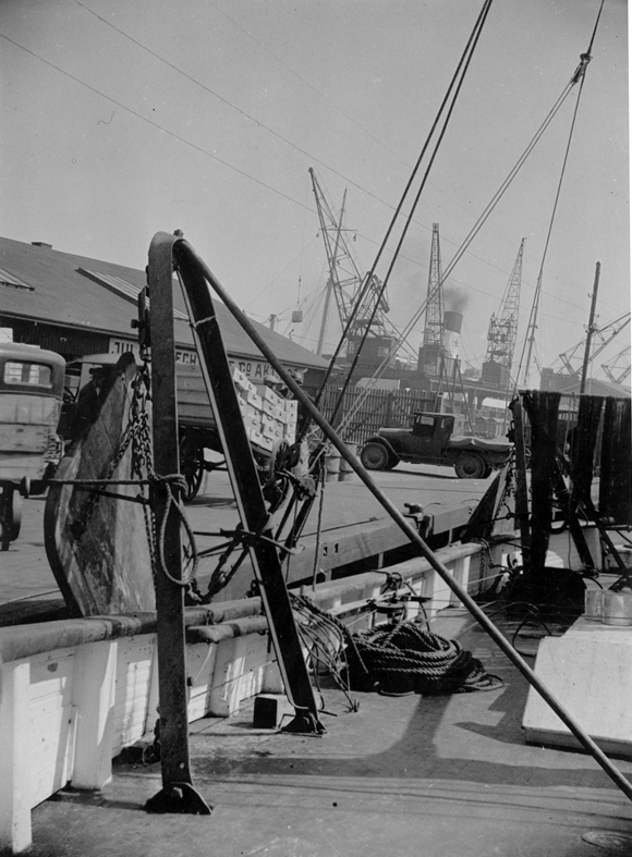 Bohuslän [fel eftersom fotografiet är i från Göteborg som ligger i Västergötland, anm. CeGe olsson] av Gravarne LL265. Trawgaljar på styrbords sida. I Fiskarhamnen i Göteborg 16/7 1934. Foto Sam Svensson