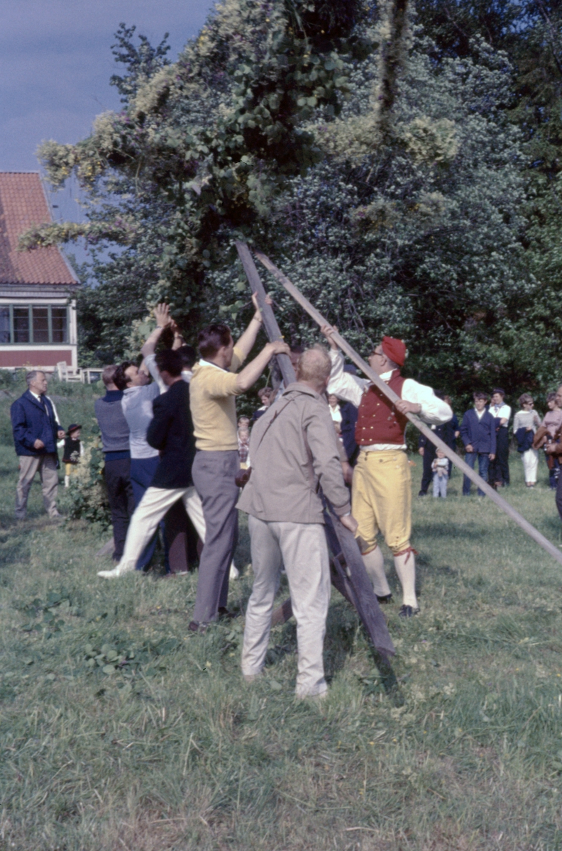 Svenska kyssarklubbens midsommarfirande vid Malma kvarn. Midsommarstången reses.