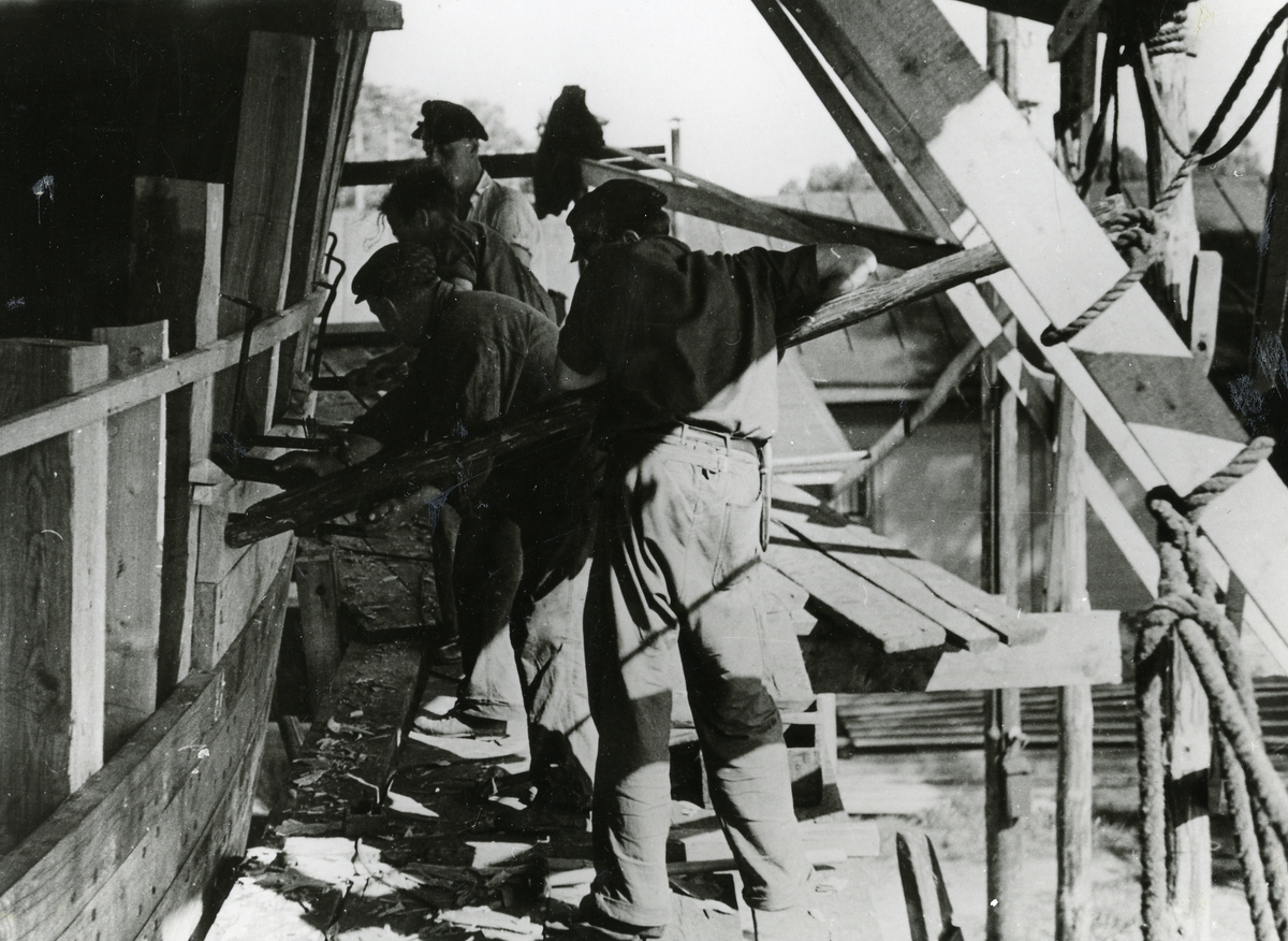 "Sätta till en bordvägsgång" på backen till Isländskt fiskefartyg under byggnad. Bordet pressas in med hjälp av en "Bändhake" och fästes med tvingar.