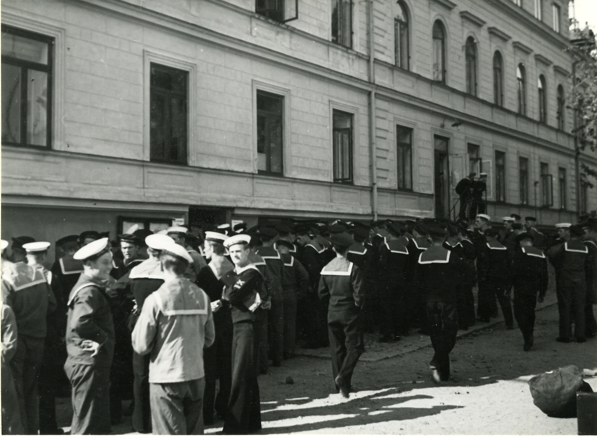 Förstärkt försvarsberedskap i september 1939, Karlskrona. Trängsel framför kompaniernas ordertavlor.