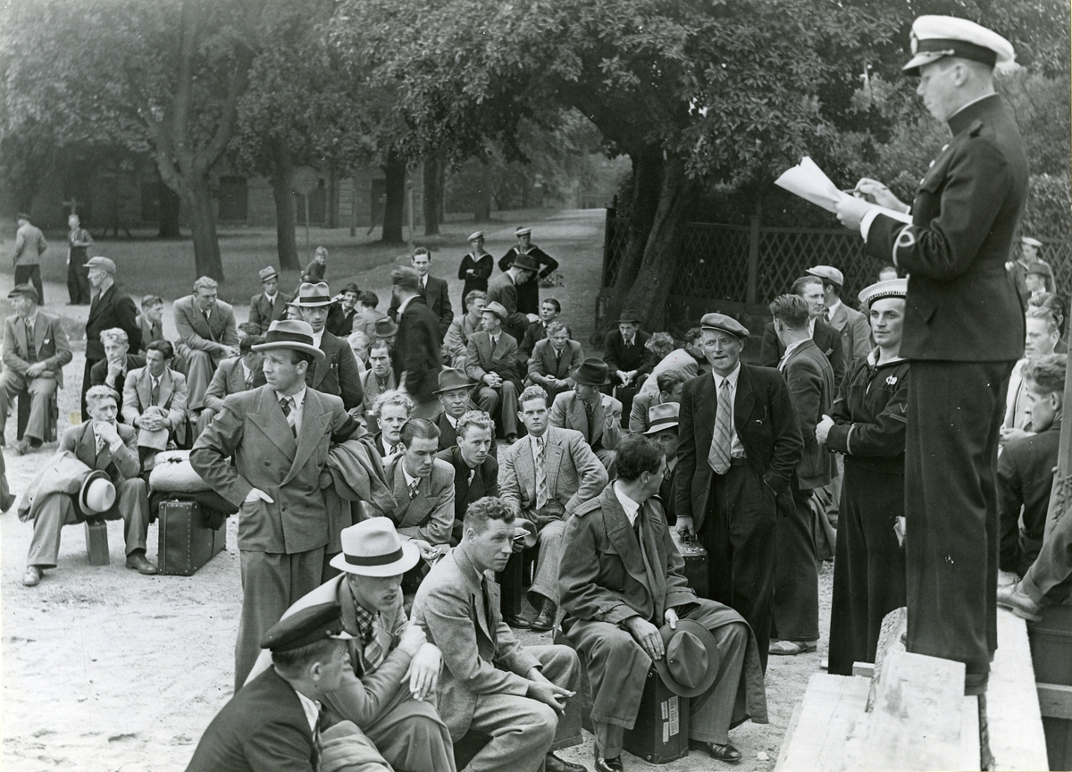 Den extra inryckningen till Flottan och Kustartilleriet, föranledd av det spända läget, tog i dag sin början. Bilden visar officer hållande upprop vid Västra brobänken före inskeppningen till Waxholm, 30/8 1939.