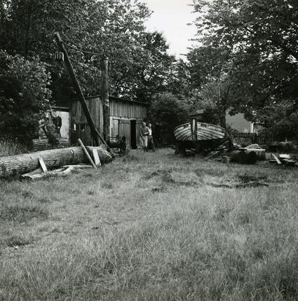 Planen söder om verkstaden. Tv om mitten förrådsboden och kranställning för stockar. Christian Madsens båtbyggeri. Foto N(ils) Nilsson aug (19)64. Danmark, Själland, Lynaes.