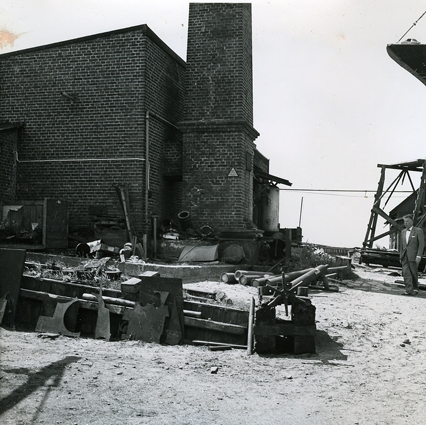 Holms skeppsvarv. Pann- och vinschhuset sett från öster. Upptill th skymtar stäven av "Bornö", som står på slipen. Skåne, Malmöhus län, Råå.