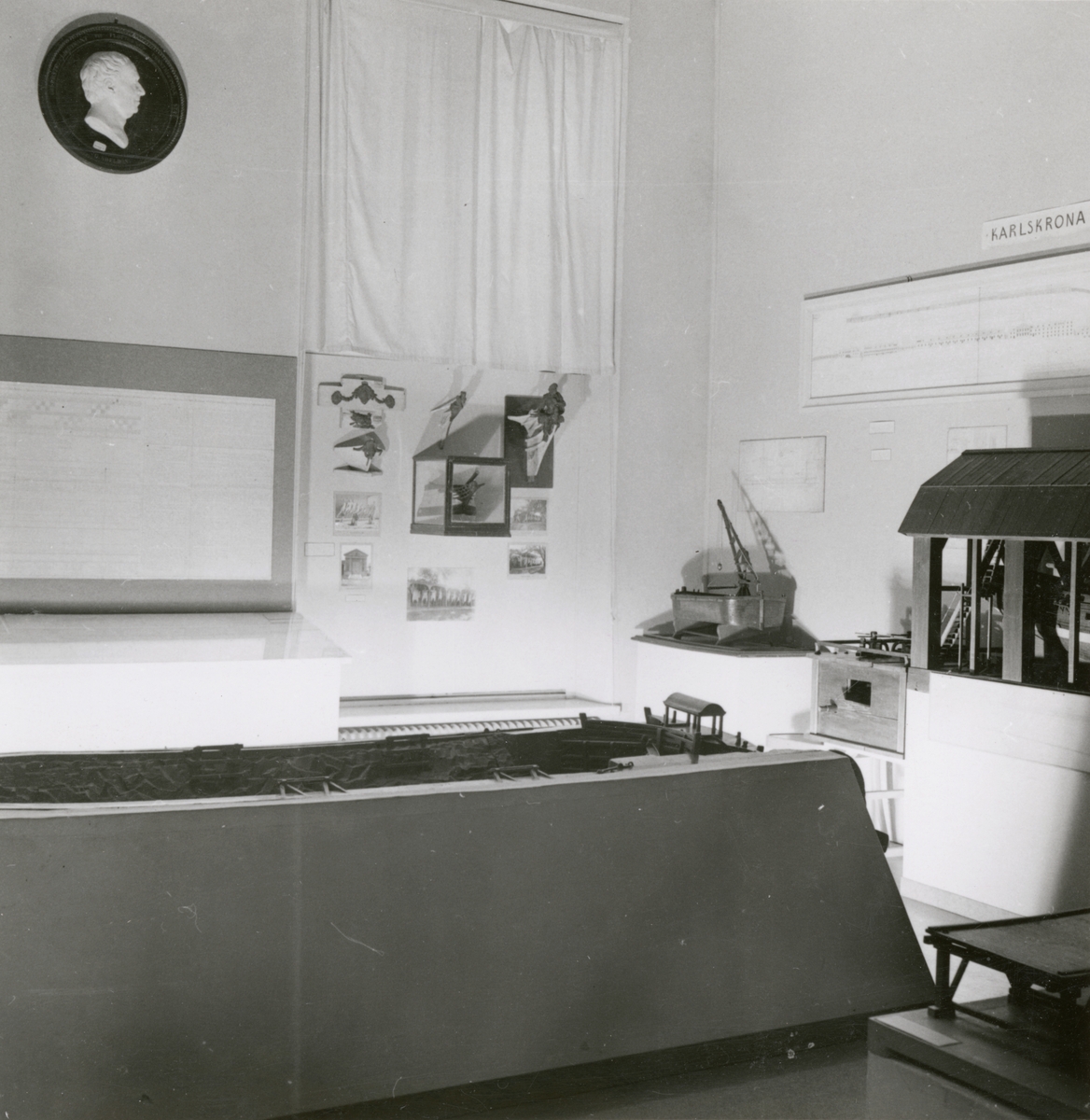 Tillfällig utställning "Chapmanutställningen" i Chapmansalen, sal 6. Östra långväggens södra del. Modeller av galjonsfigurer, varvsmodeller, ritningar m.m.
