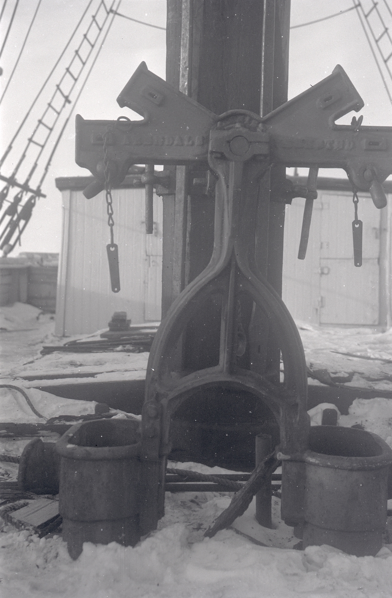 [från fotobeskrivningen:] "Pump på däck vid stormasten. Pumpen märkt ARENDALS VERKSTAD. Upphuggning av 3-mastade skonertskeppet ZIBA AV KALMAR [sic] på Vätö, Uppland mars 1940." [---]