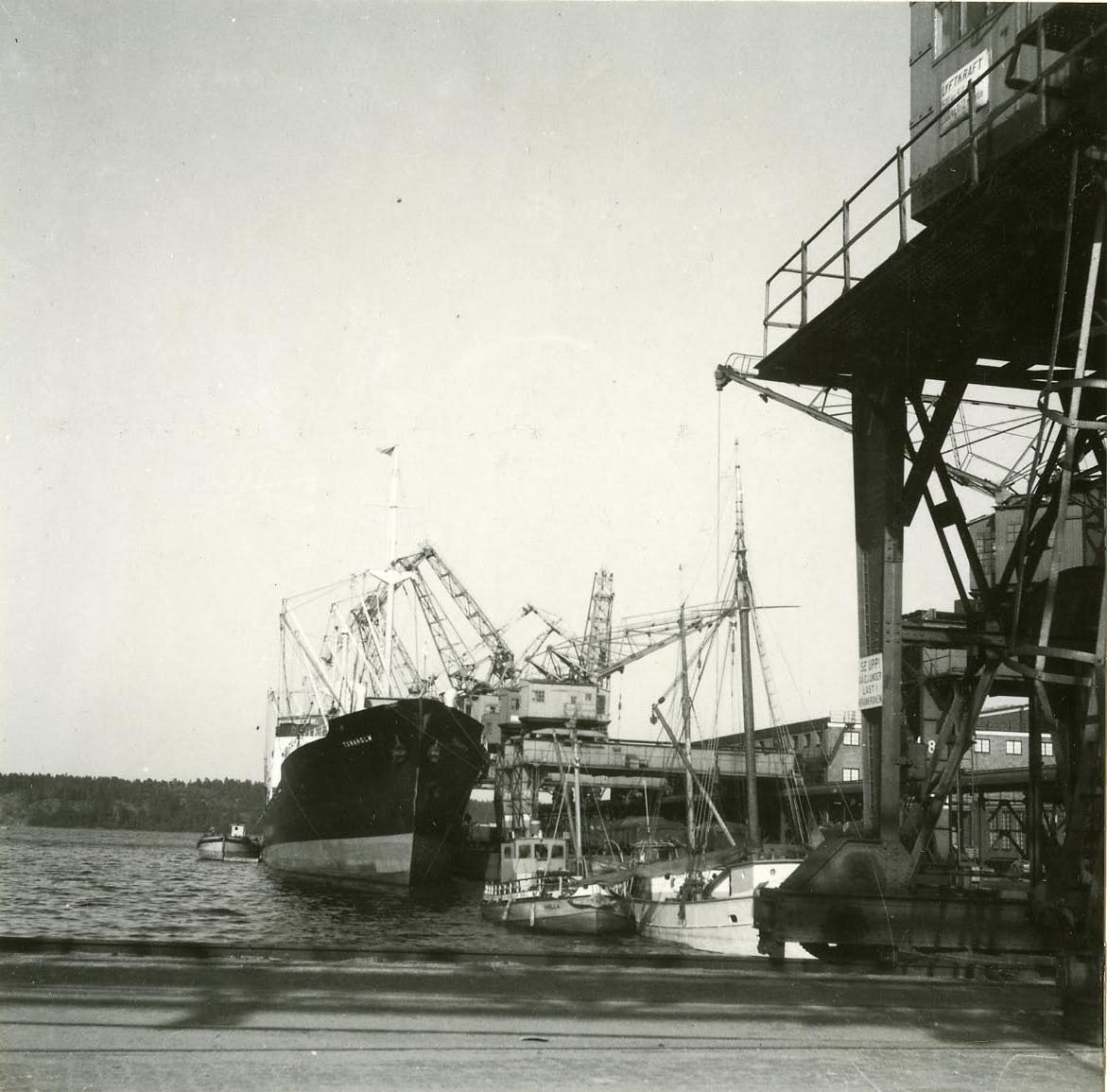 Titel: Frihamnen i Stockholm, hösten 1940. En ångare vid kajen för lossning.