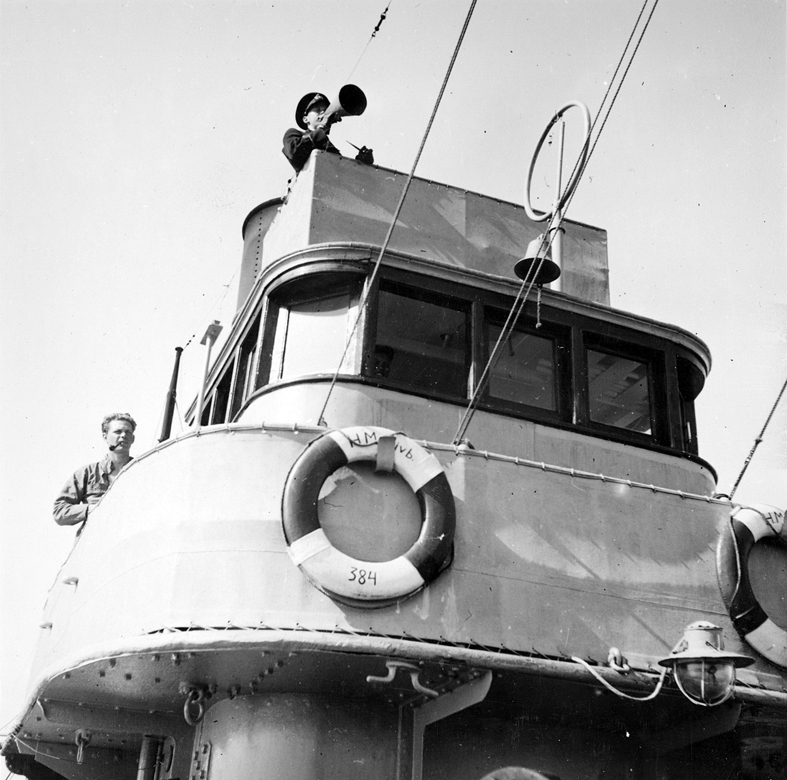 Hjälpvedettbåt 384. Från övre bryggan ger fvartygschefen order i ropare till folken(t) på backen. Fil lic Gunnar Jonssons undersökningsresa till Västkusten juni 1940.