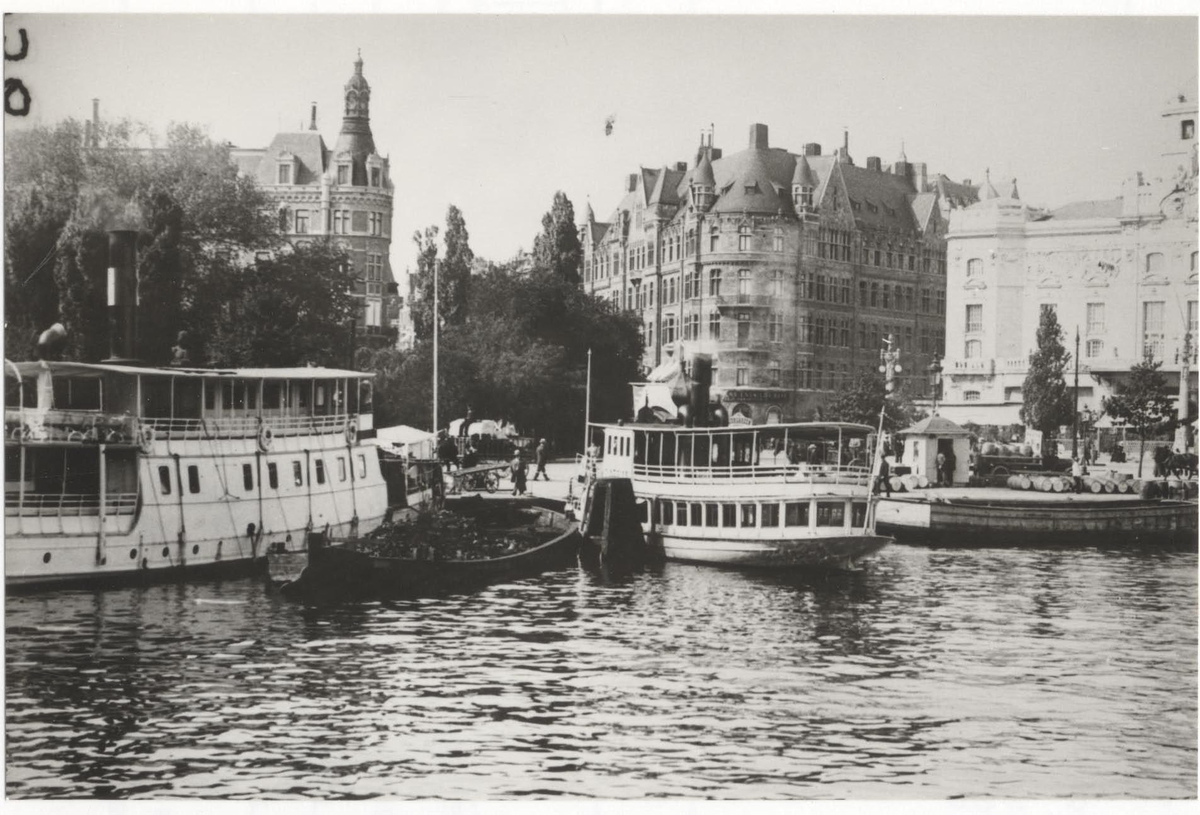 Stockholm, Nybrokajen med fr v S/S DALARÖ, namnlös kolpråm, S/S LÄRKAN.